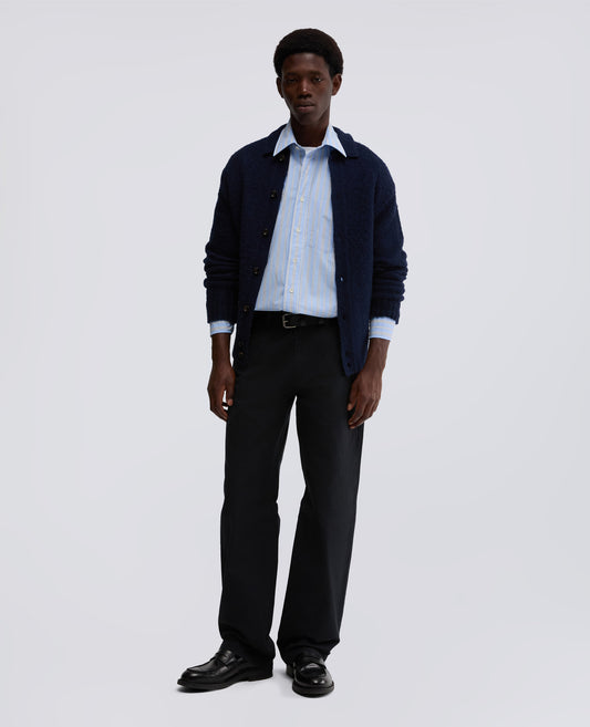Shirt-style cardigan made from brushed pure Shetland wool. The model features a front button fastening and a shirt collar. A refined rib knit finishes off the cuffs and hem of the piece. Regular fit.- €320,00