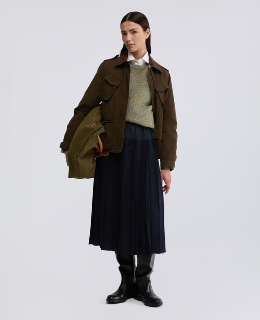 Falda longuette confeccionada en raso de tejido tecnico plisado. Presenta un diseno acampanado con canesú de nailon liso en contraste y cordon ajustable en la cintura con herrete. Modelo sin forro. Corte amplio.- 3.400,00 kr