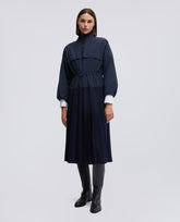 Abito midi con corpo e maniche in tela di nylon e gonna sfoderata in raso di tessuto tecnico. Il modello presenta un collo alto ed e dotato di una chiusura frontale con zip corta. Il capo e caratterizzato da maniche lunghe raglan con elastico...- €720,00